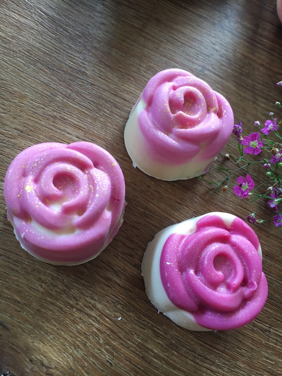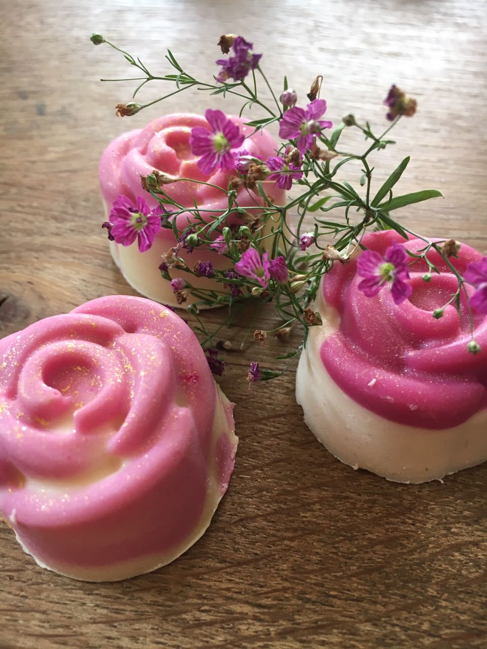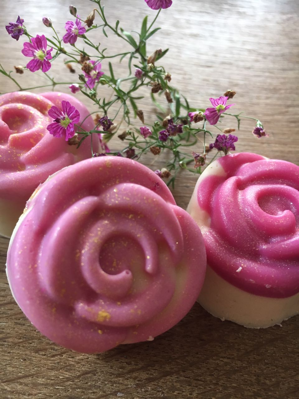 Und wenn Du selbst bald heiratest, oder einen runden Geburtstag feierst, ein Firmen Event planst, oder, oder, oder…..Gemeinsam können wir Form und Farbe bestimmen, die Inhaltstoffe festlegen und es muss ja auch nicht immer Seife sein. Badepralinen sind auch eine tolle Aufmerksamkeit – mit Blüten und Kakaobutter oder sprudelnd frisch!